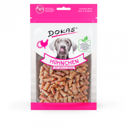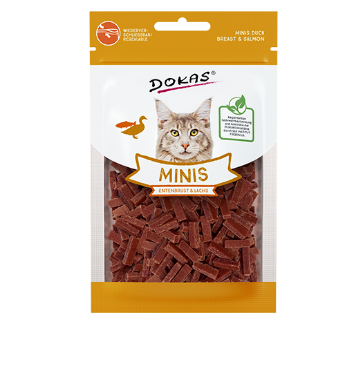 Sortiment DOKAS lze popsat stručně a jasně: Vyrábíme prémiové pamlsky pro psy a kočky. Je známo, že láska se projevuje v detailech. U nás je tomu také tak. Proto klademe maximální důraz na kvalitu a výběr našich surovin a na jejich šetrné zpracování. Náš rozmanitý sortiment se vyznačuje širokým spektrem, od rychlých pamlsků za odměnu až po žvýkací zábavu na dlouhé hodiny. Pro každou chuť tu máme něco. Všechny pamlsky jsou zabalené do sáčků, uchovávajících čerstvost, s transparentním okénkem, aby se milovníci zvířat mohli před nákupem přesvědčit o tvaru, velikosti a kvalitě dobrot, které jsou uvnitř.